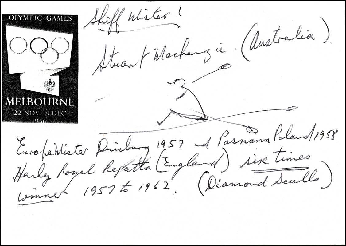 MacKenzie, Stuart | (1937-2020) Blancobeleg mit handschriftlichen Text, Zeichung und original Signatur von Stuart MacKenzie (AUS). Silbermedaille bei den den Olympischen Spielen 1956 im Rudern - Einer, 15x10 cm.