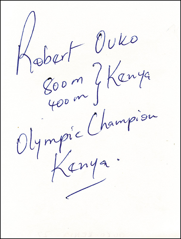 Ouko, Robert | (1948-2019) Blancobeleg mit original Signatur von Robert Ouko (KEN). Goldmedaille bei den Olympischen Spielen 1972 mit der 4x400 Staffel von Kenia, 10x7,5 cm.