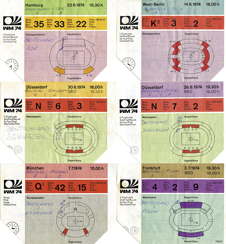 Eintrittskarte WM1974 | 6 verschiedene Eintrittskarten von den Spielen des DFB bei Fußball - Weltmeisterschaft 1974. Deutschland v 1) Chile 14.6. 2) DDR, 22.6. 3) Jugoslawien 26.6. 4) Schweden. 5) Polen 3.7. 6) Endspiel Holland 7.7., je 15x10,5 cm.