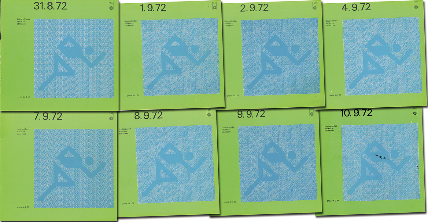 Programm - OS1972 | 8 verschiedene offizielle Tagesprogramm zu den Olympischen Spielen 1972 in München für Leichtathletik (31.8.; 1.9.- 4.9.; 7.9. -10.9). Komplett! (am 5.9. und 6.9. fanden keine Wettbewerbe statt).