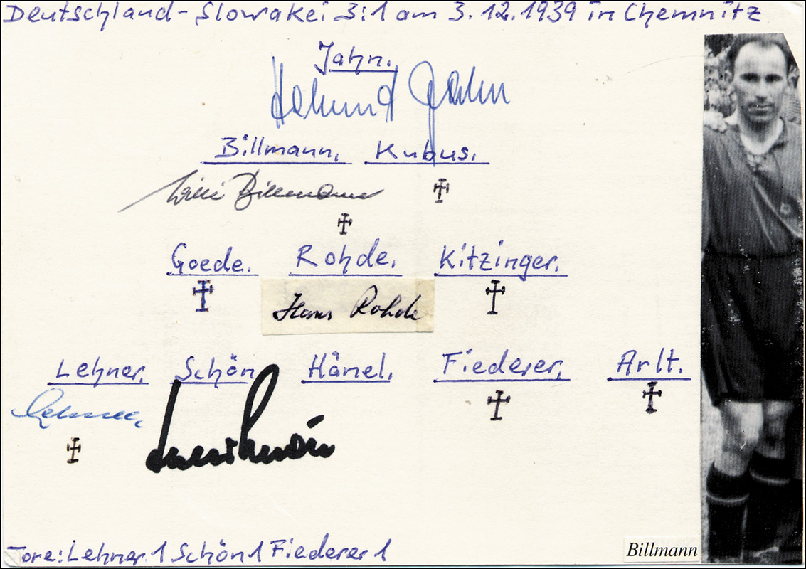 Nationalmannschaft 1939 | Blancokarte mit 5 original Signaturen von deutschen Nationalspielern vom Länderspiel gegen die Slowakei am 3.12.1939 in Chemnitz. 14,5x10,5 cm.
