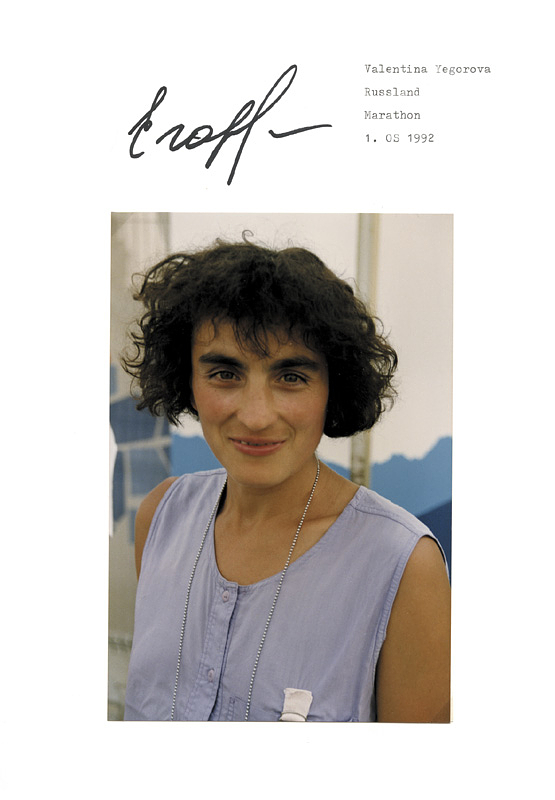 Jegorowa, Walentina | DIN-A4 Karton mit original Signatur von Walentina Jegorowa RUS). Goldmedaille bei den Olympischen Spielen 1992 und Silber 1996 jeweils im Marathon. Mit aufmontiertem Farbfoto,30x21 cm.