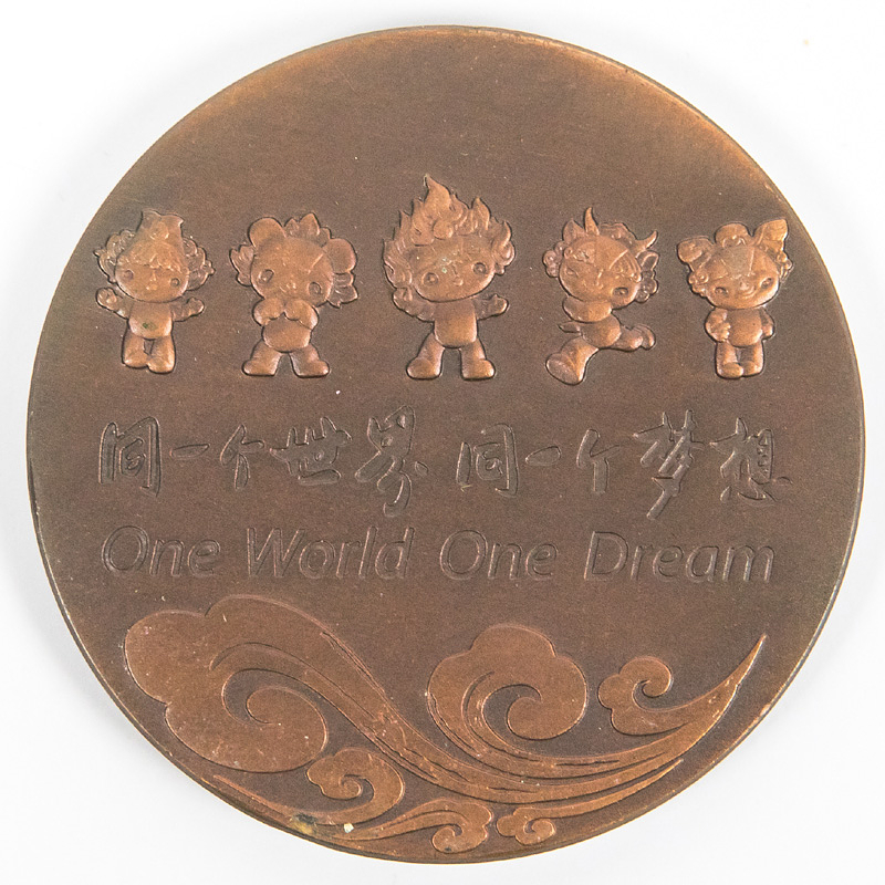 Teilnehmermedaille 2008 | Offizielle Teilnehmermedaille für Athleten für die Olympischen Sommerspiele Peking 2008. Bronze.(5,6 cm). In Originalpräsentationsbox. (12x12x3 cm).