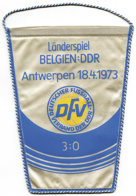 DDR - Spielwimpel 1973 | Offizieller Spielwimpel des Fußball Verbandes der DDR für die Spieler des DDR-Teams mit Aufdruck "Länderspiel Belgien - DDR. Antwerpen 18.4.1973. 3:0". Bedruckter Leinenwimpel mit blau-weißer Bordüre. 21x16 cm.