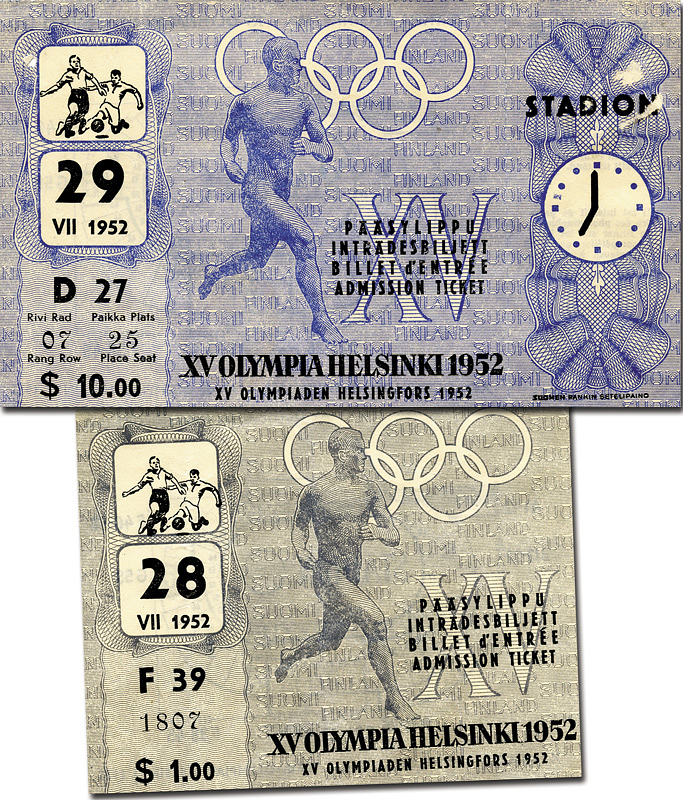 Eintrittskarte OSS1952 | Olympische Spiele 1952 Helsinki. 2 Eintrittskarten Fußball 1) 28.7. Halbfinale Ungarn - Schweden (6:0); 4) 29.7.: Halbfinale Jugoslawien - Deutschland (3:1). Je 11x9 cm und 15x9 cm.