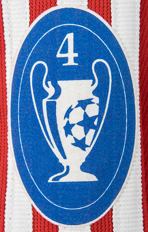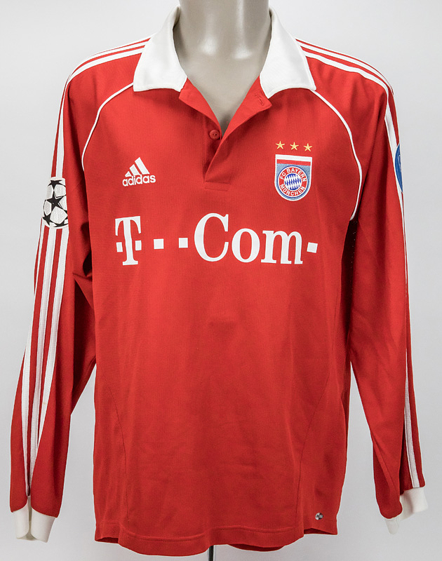 Trikot kurzarm mit Knopfleiste; Größe XL; Vereins-Logo, 3 Meister Sterne und adidas-Logo gestickt, Werbeaufschrift '-T---' gummiert; Rückennummer, Spielername gummiert; Trikot hat Gebrauchsspuren (Rückennummer leicht rissig); mit CL Starball Patch und UEFA CL 4 Trophy Patch; adidas climacool. Zustand: A-