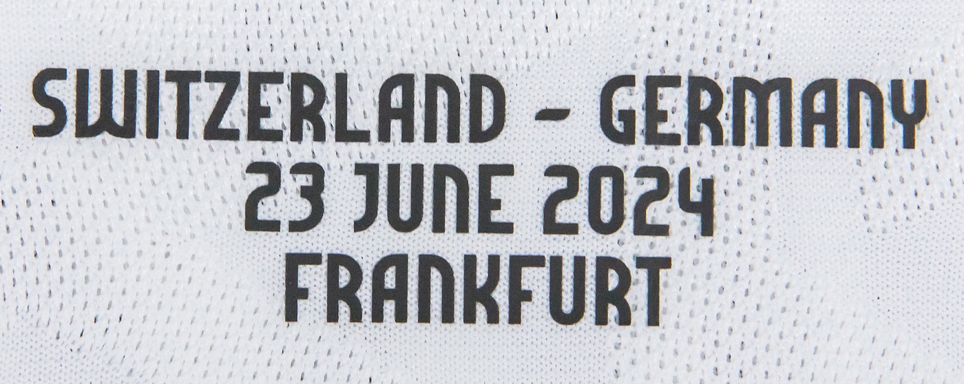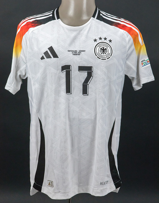 Trikot kurzarm; Größe M; DFB-Logo, 4 Weltmeister-Sterne und adidas-Logo gummiert; Match Details, Spielername und Rückennummer (vorn und hinten) gummiert; Schriftzug 'Deutschland' auf Kragenrückseite gummiert; Trikot mit UEFA Euro 2024 Trophy Patch und UEFA Foundation für children Patch; adidas Heat.Rdy. Trikot kommt aus der Sammlung eines DFB - Funktionärs. Zustand: A