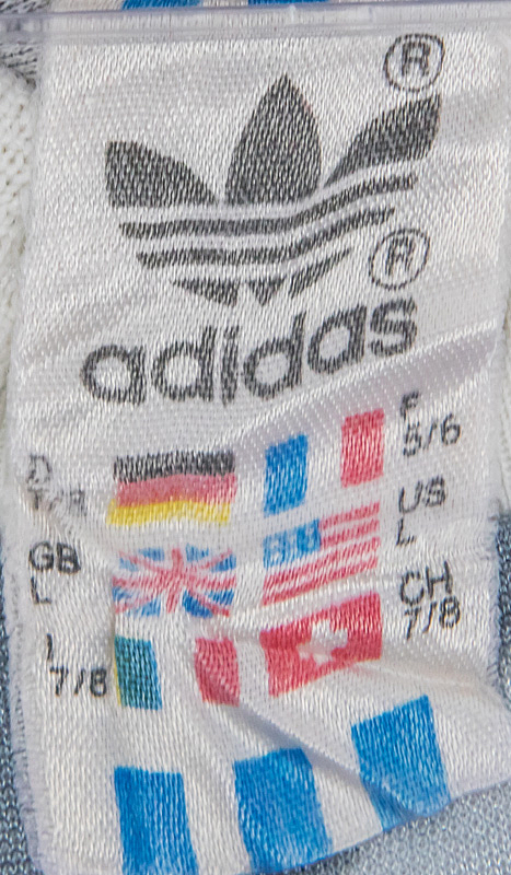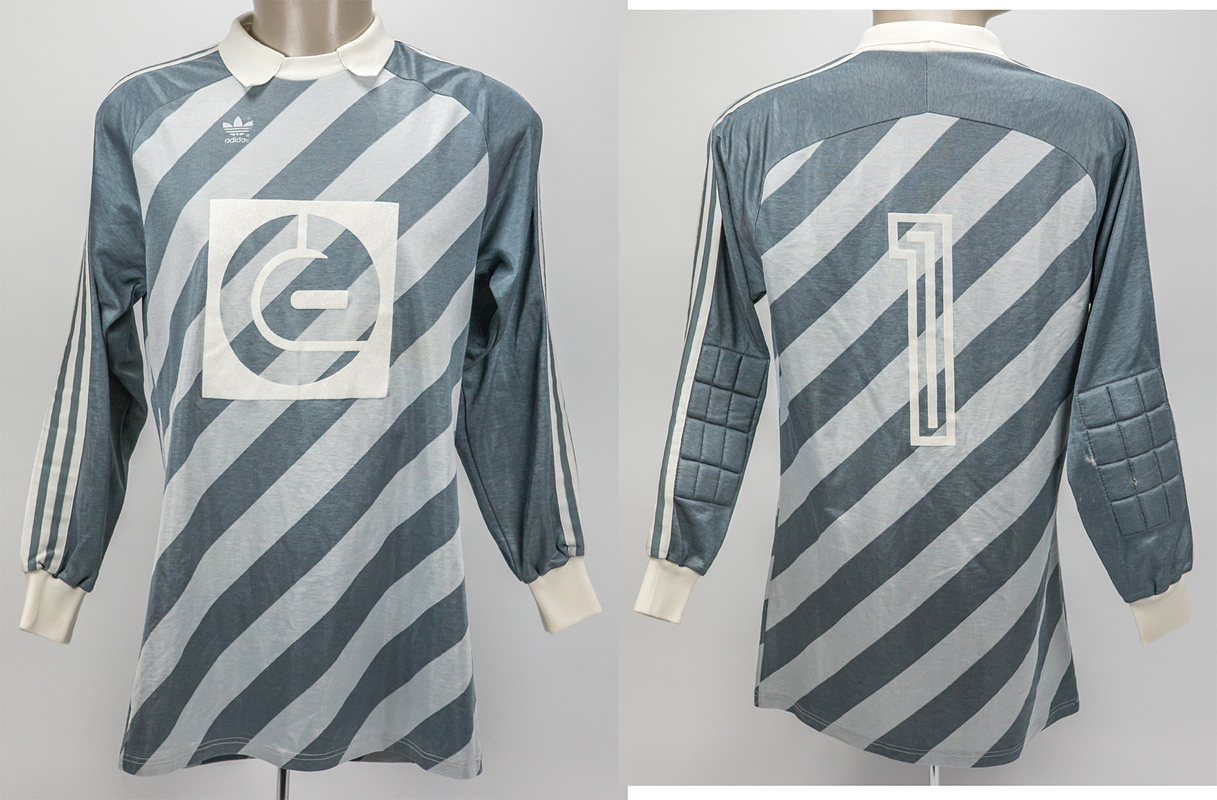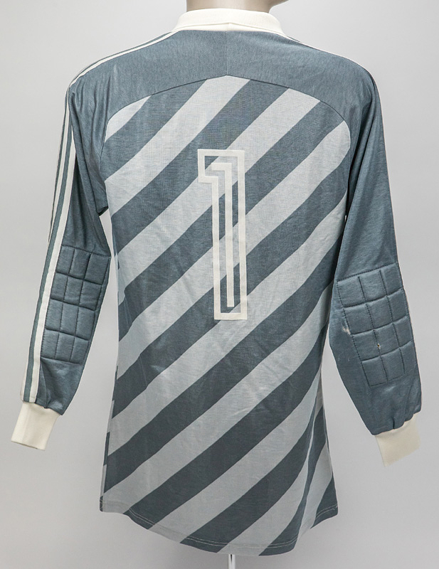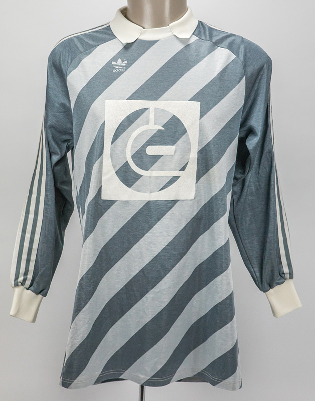 Torwart-Trikot langarm mit Armpolster; Größe 7/8; Werbeaufdruck gummiert; adidas-Logo aufgedruckt; Rückennummer geflockt; Trikot hat Gebrauchsspuren (adidas-Logo leicht verwaschen); adidas. Zustand: A-