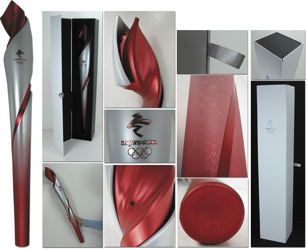 Olympiafackel 2022 | Original Olympiafackel "Flying" von den Olympischen Winterspielen Peking 2022 mit aufgesetztem Logo der Winterspiele und der Aufschrift "Beijing 2022". Desgin von "Lenovo Team". Leichtmetall, 82 cm. In original Präsentationsbox (88x16,2x16,2 cm). Dabei original Ständer für die Fackel.