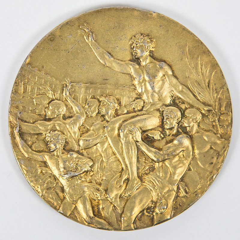 Medaille(Zustand: A-B) leicht angelaufen; kleine Dellen am Rand und Spuren von Goldtests. (Die Medaille von Carl Lorenz (1913-1993), die AGON ca. 1995 verkauft hat, wies ähnliche Spuren auf. Offensichtlich waren beide Athleten der Ansicht, dass diese Medaille aus massiven Gold bestehen würde und waren sichtlich enttäuscht. Beide Medaillen haben Dellen. Anmerk. W.Fuhr). Etui stark berieben; Goldprägung nicht mehr vorhanden (Zustand: C. Der Einlieferer hat diese Medaille ca. vor 25 Jahren direkt aus dem Nachlass von Ernst Ihbe erhalten. Zustand: