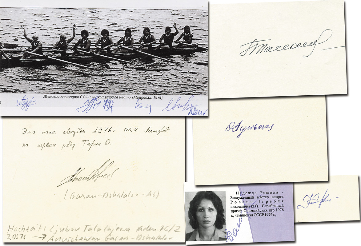 UdSSR Rudern Frauen OSS1976 | Silbermedaille im Achter Rudern der Frauen für die UdSSR bei den Oympischen Spielen 1976. Mit original Signaturen von Ljubow Talalajewa (1953-2021), Nadeschda Roschtschina, Klavdija Koženkova, Olena Subko, Olha Kolkowa, Nadeschda Roschon, Olha Husenko, Nelli Tarakanowa, Olha Puhowska. KOMPLETTES TEAM! Verschiedene Belege, 18x10 cm bis 8x6 cm.