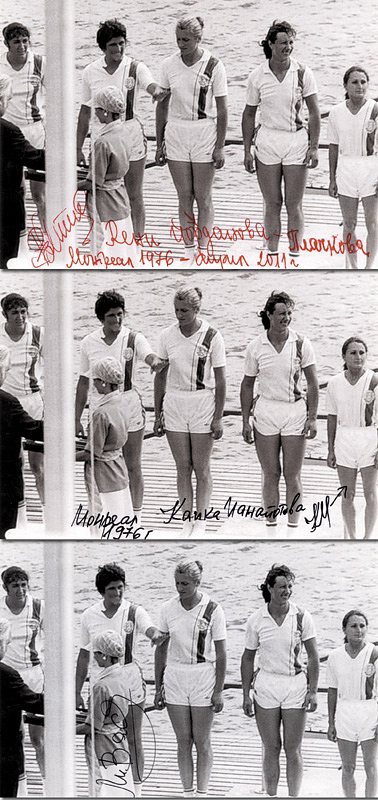 Bulgaria Rudern Frauen OSS1976 | Silbermedaille im Vierer mit Steuerfrau im Rudern der Frauen für Bulgarien bei den Oympischen Spielen 1976. Mit original Signaturen von Ginka Gjurowa, Marijka Modewa, Liljana Wassewa, Reni Jordanowa und Kapka Georgiewa. KOMPLETTES TEAM! S/W-Reprofotos, 14x10 cm.