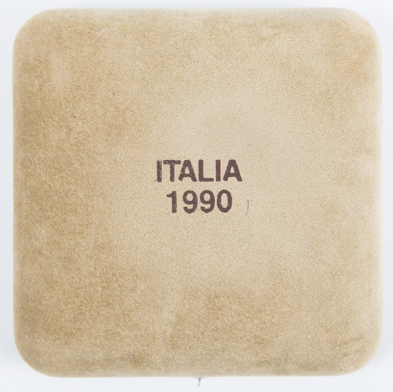 Teilnehmermedaille WM1990 | Teilnehmermedaille „Coupe du monde de la FIFA Italie 1990“ Hersteller: "Huguenin". Bronze, 5 cm. In original Wildlederbox mit dem Aufdruck "Italia 1990".
