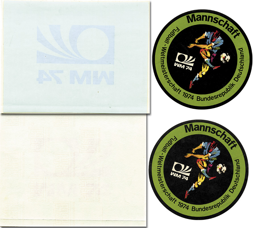 Aufkleber WM 1974 | Vier Aufkleber der Fußball-Weltmeisterschaft 1974: 2x Mannschaft und 2x Organisationiskomitee Autoinnenscheiben Aufkleber "WM74", jeder ca 13x12 cm.