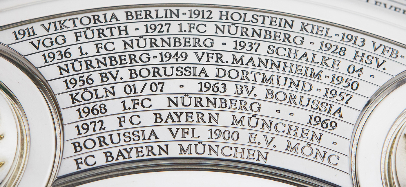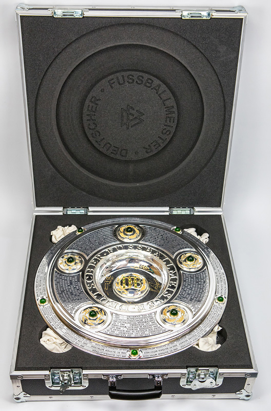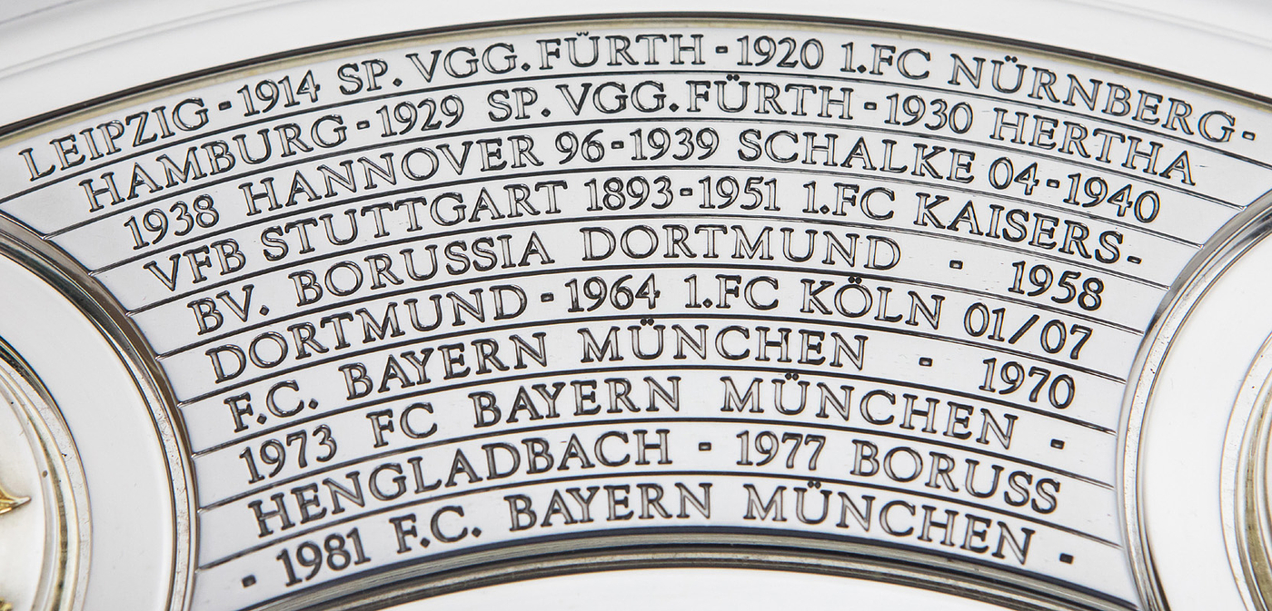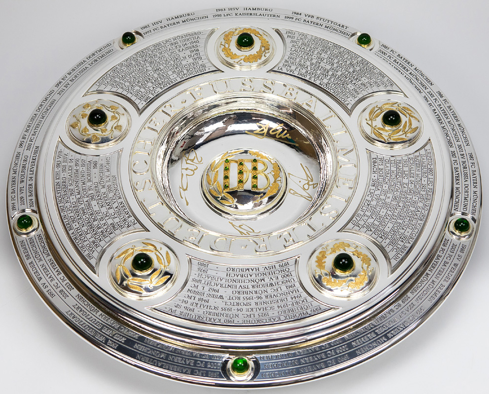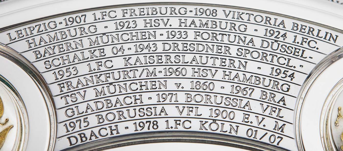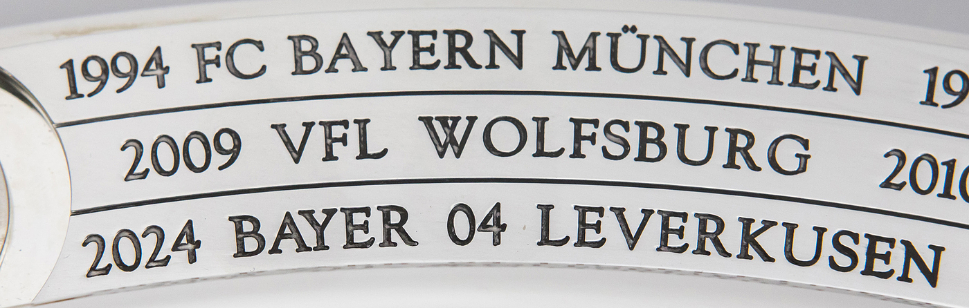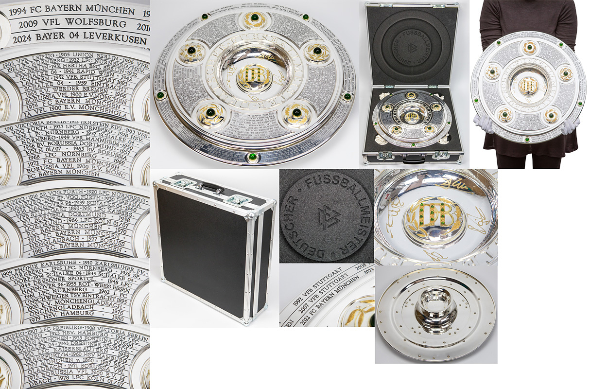 Hochwertige, von einem Goldschmied feingearbeitete und detailgenaue Reproduktion. Die Produktionskosten für diese hochwertige Replica lagen 2024 bei 20.111 € (inkl.Mwst). Eine Kopie der original Rechnung (Käufername ist jedoch geschwärzt) erhält der Käufer dieser Meisterschafle. Durch den DFB genehmigte Reproduktion der Meisterschale von 2024, darf nur in diesem jahr angefertigt werden. Ab 1981 wurde die DFB-Meisterschale verändert, da die Namen der Titelträger, die auf dem Rand graviert wurden, ausgeschöpft war. Die Meisterschale wurde durch einen 4,5 cm starken Ring erweitert, d.h. die ursprüngliche Größe der Schale wurde von 54,5 cm Durchmesser auf 59 cm Durchmesser erweitert. Der Platz für weitere Namen ist begrenzt, d.h. ab der Meisterschaft 2026/27 muß eine Veränderung der Meisterschale vorgenommen werden, da kein weiterer Name eines Klubs mehr aufgebracht werden kann. Offizielle Reproduktionen von Meisterschalen dürfen ausschließlich Mannschaften herstellen die den deutschen Meistertitel errungen haben und das Recht bekamen sich ein verkleinerte Kopie der Meisterschale für ihre Trophäen-Vitrine anfertigen zu lassen. Dies kann nur mit Genehmigung des DFB geschehen. Die Ersatzmeisterschalen sind ca. 18% kleiner wie das Original und wesentlich leichter und nur versilbert, damit es keine Verwechselungen geben kann und die Einmaligkeit des Originals gewahrt bleibt. Der DFB hat die Originalmeisterschale mit 50.000 € versichert, das entspricht in etwa dem Materialwert und den Herstellungskosten. Der Marktwert der Schale dürfte angesichts der boomenden Bundesliga bei ca. 1 Millionen Euro liegen. Dabei zwei Fotoausdrucke mit der Meisterschale und Spielern von Bayer Leverkusen. Mit Echtheitszertifikat. Herkunft: Direkt von einem ehemaligen Mitarbeiter von Bayer Leverkusen, der sich 2024 diese Replica anfertigen ließ als eines von nur zwei Exemplaren. Zustand: A-