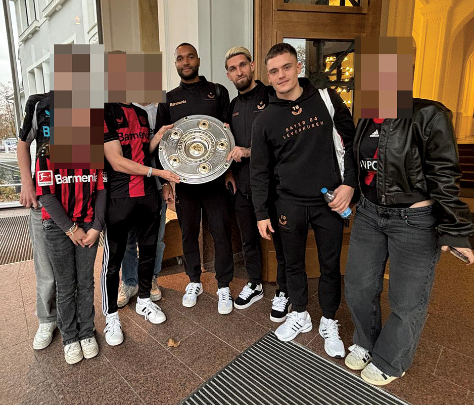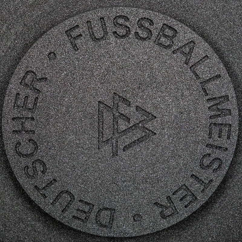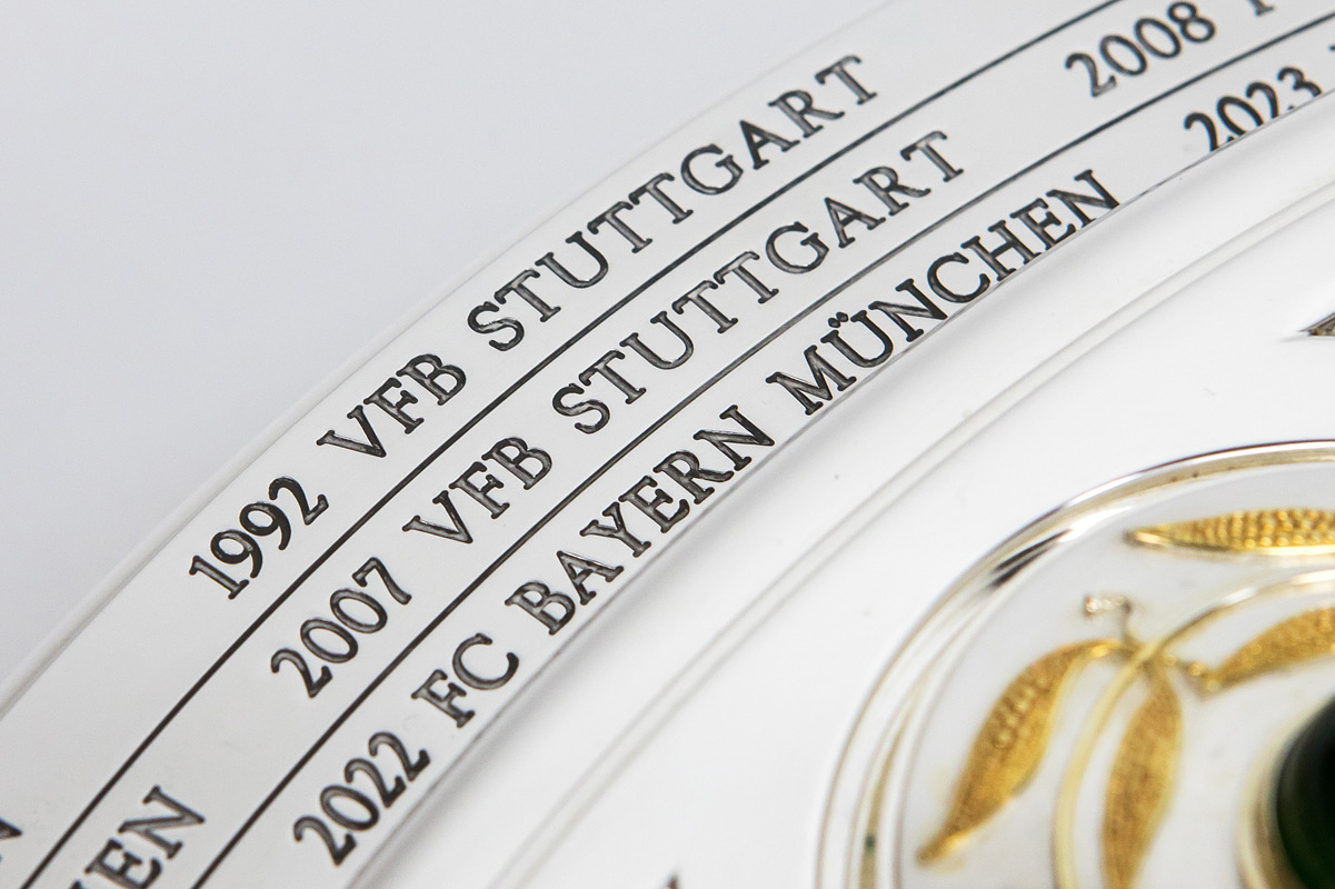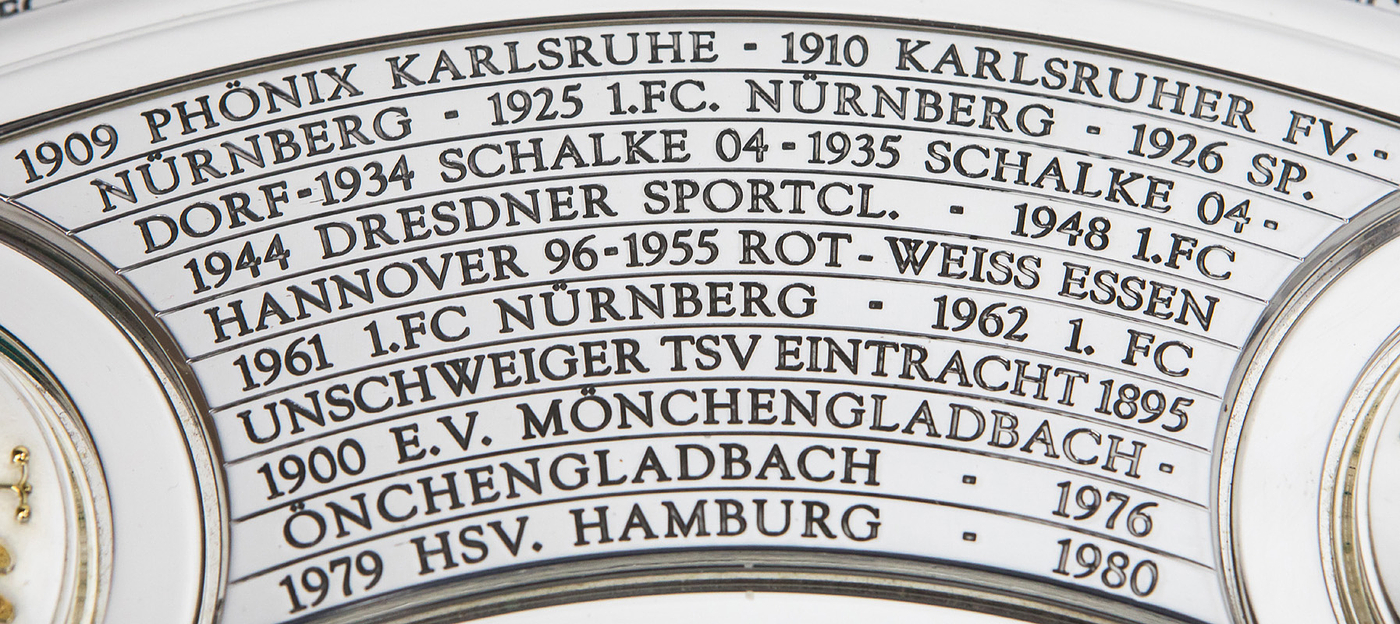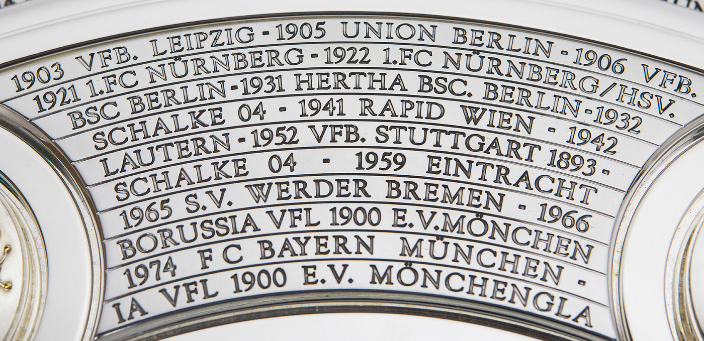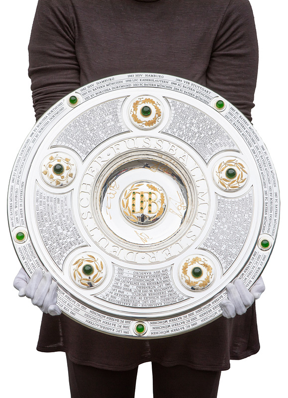 Hochwertige, von einem Goldschmied feingearbeitete und detailgenaue Reproduktion. Die Produktionskosten für diese hochwertige Replica lagen 2024 bei 20.111 € (inkl.Mwst). Eine Kopie der original Rechnung (Käufername ist jedoch geschwärzt) erhält der Käufer dieser Meisterschafle. Durch den DFB genehmigte Reproduktion der Meisterschale von 2024, darf nur in diesem jahr angefertigt werden. Ab 1981 wurde die DFB-Meisterschale verändert, da die Namen der Titelträger, die auf dem Rand graviert wurden, ausgeschöpft war. Die Meisterschale wurde durch einen 4,5 cm starken Ring erweitert, d.h. die ursprüngliche Größe der Schale wurde von 54,5 cm Durchmesser auf 59 cm Durchmesser erweitert. Der Platz für weitere Namen ist begrenzt, d.h. ab der Meisterschaft 2026/27 muß eine Veränderung der Meisterschale vorgenommen werden, da kein weiterer Name eines Klubs mehr aufgebracht werden kann. Offizielle Reproduktionen von Meisterschalen dürfen ausschließlich Mannschaften herstellen die den deutschen Meistertitel errungen haben und das Recht bekamen sich ein verkleinerte Kopie der Meisterschale für ihre Trophäen-Vitrine anfertigen zu lassen. Dies kann nur mit Genehmigung des DFB geschehen. Die Ersatzmeisterschalen sind ca. 18% kleiner wie das Original und wesentlich leichter und nur versilbert, damit es keine Verwechselungen geben kann und die Einmaligkeit des Originals gewahrt bleibt. Der DFB hat die Originalmeisterschale mit 50.000 € versichert, das entspricht in etwa dem Materialwert und den Herstellungskosten. Der Marktwert der Schale dürfte angesichts der boomenden Bundesliga bei ca. 1 Millionen Euro liegen. Dabei zwei Fotoausdrucke mit der Meisterschale und Spielern von Bayer Leverkusen. Mit Echtheitszertifikat. Herkunft: Direkt von einem ehemaligen Mitarbeiter von Bayer Leverkusen, der sich 2024 diese Replica anfertigen ließ als eines von nur zwei Exemplaren. Zustand: A-