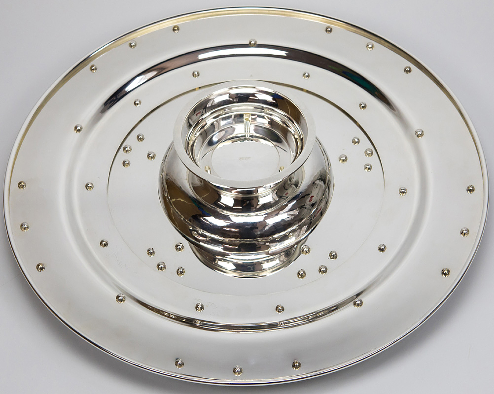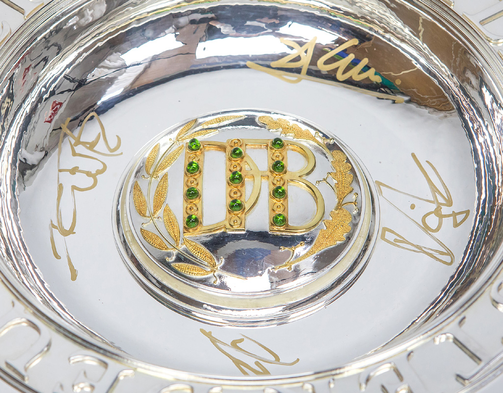 DFB-Meisterschale 2024 Bayer Leverkusen | Offizielles Replikat der DFB-Meisterschale für die Saison 2023/24 für den deutschen Meister 2024 Bayer Leverkusen. Der jeweilige deutsche Meister hat das Recht Replikas in dieser Größe offiziell anfertigen zulassen. Letzte Inschrift auf der Schale "Bayer Leverkusen 2024". Versilbert, Messing, ziervergoldet, Gravuren. Hersteller: Koch & Bergfeld, Bremen. Gewicht: 6,6 kg, Durchmesser 52 cm. Mit original Koffer, innen mit geprägtem DFB-Logo. 59x59x18cm. Mit original Signaturen von Xabi Alonso, Florian Wirtz, Jonathan Tah und Robert Andrich. Weil die Spieler von Bayer Leverkusen von ihrem Trainer Xabvi Alsonso anläßlich der Deutschen Fußballmeisterschaft eine kleine Meisterschale (ca. 18 cm) aus Silber bekamen, machte keiner der Spieler von seinem Recht gebrauch sich von der Firma Koch & Bergfeld eine fast 1:1 Kopie der orignal Meisterschale anfertigen zu lassen. Es wurden laut Aussagen des Einlieferes lediglich zwei Exemplare produziert. Ein Exemplar befindet sich im Museum / Klubräumen von Bayer Leverkusen in der BayArena. Das andere Exemplar wird in dieser Auktion angeboten. Mit original Plexiglasständer für diese Meisterschale. EIN HIGHLIGHT FÜR JEDE SAMMLUNG!.