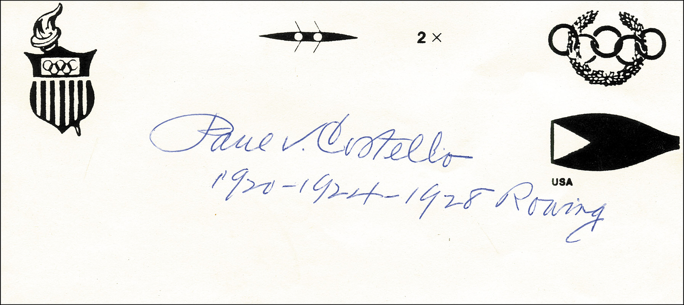 (1894-1986) Sammlerbeleg mit Originalsignatur von Paul Vincent Costello (USA). Dreifacherer Goldmedaillengewinner im Ruderer - Dopplzweier bei Olympischen Spielen 1920 , 1924 und 1928. 19x8,5 cm.