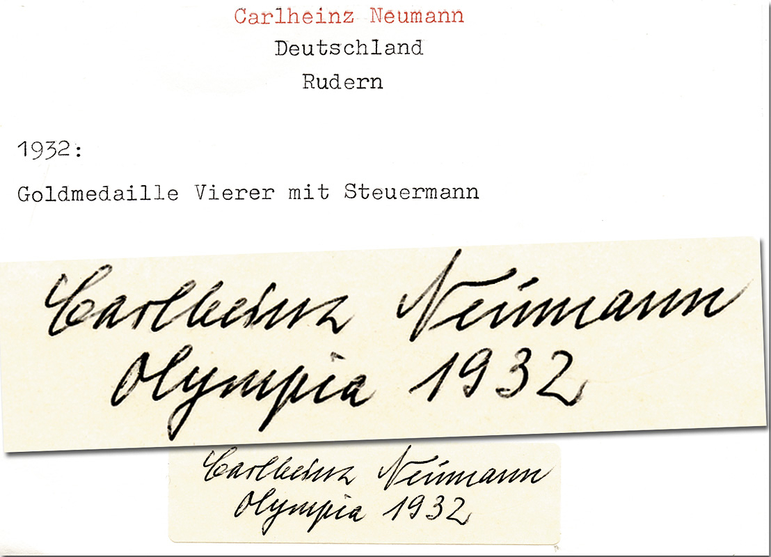(1905-1983) Karteikarte mit aufmontierter Originalsignatur von Carlheinz Neumann (GER). Goldmedaille bei den Olympischen Spielen 1932 im Rudern (Vierer mit Steuermann). 14,5x10,5 cm.