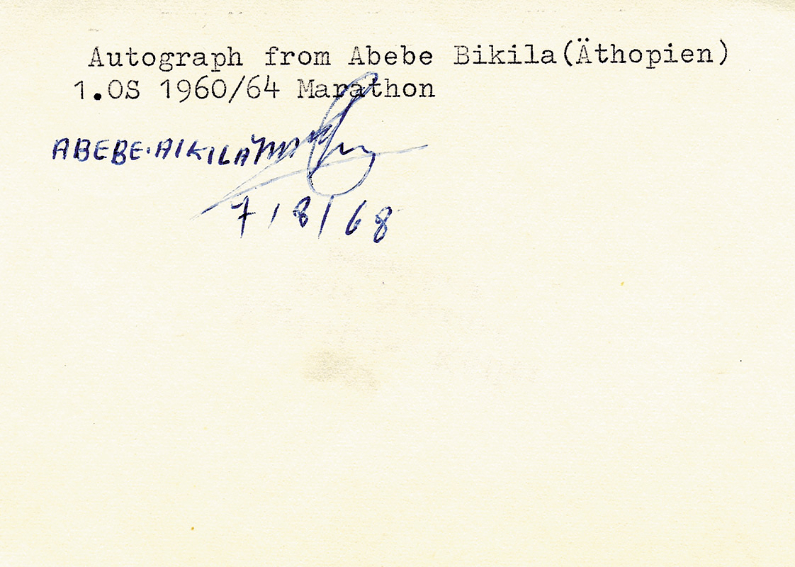 (1932-1973) Blancobeleg mit Originalsignatur von Abebe Bikila. Äthiopischer Marathonläufer. Olympiasieger 1960+1964 im Marathonlauf. 10,5x8 cm.