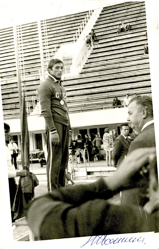 (1949-2018) S/W-Foto mit original Signatur von Nikolai Pankin (URS). Bronze Medaille bei den Olympischen Spielen 1968 im Schwimmen über 100 m Rücken, 14x9 cm.