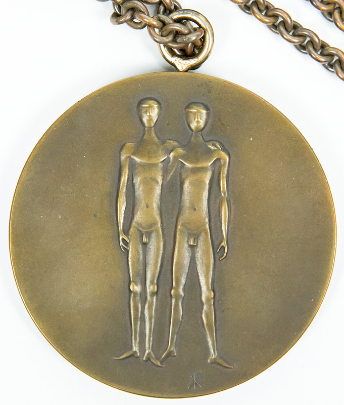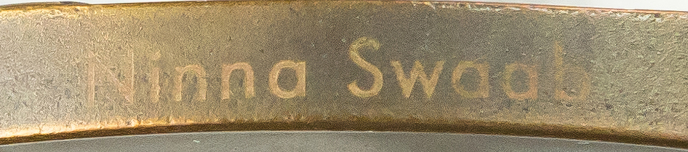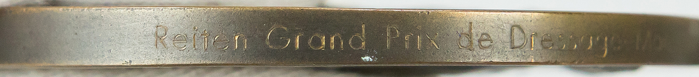 Bronzemedaille für den 3.Platz von Ninna Swaab auf „Casanova“ mit der Mannschaft von Schweden im Reiten - Dressur Mannschaft bei den Olympischen Spielen München 1972. (Entwurf von G.Cassioli und G.Marcks). Bronze, 6,6 cm mit original Kette. Mit Randgravur "Reiten Grand Prix de Dressage - Mannschaft" und den Namen der Reiterin "Ninna Swaab". Dabei original Pin von Ninna Swaab für die Bronzemedaille der zusammen mit der Medaille vergeben wurde (1,1x1,1 cm).