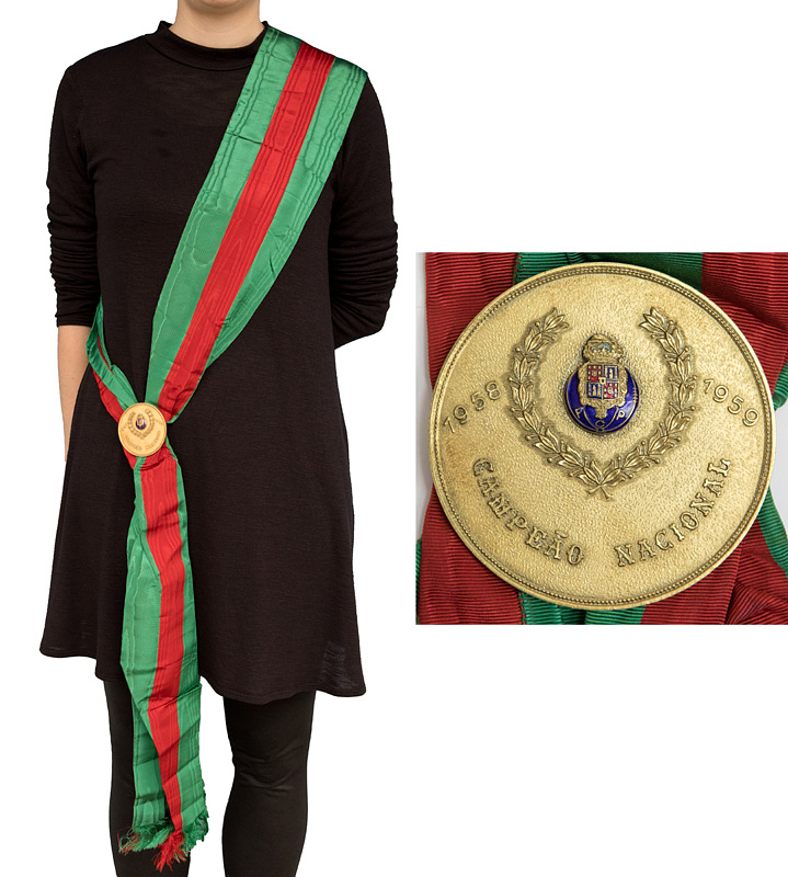 „Campeao Nacional 58-59“ offizielle Meisterschaftsscherpe in den Vereinsfarben des FC Porto mit Fransen aus Seide zusammengehalten von einer schweren Bronzeplakette mit aufgesetztem farbig emaillierten Vereinslogo. Gesamtlänge 220 cm x 13,5 cm. Durchmesser der Plakette 6,5 cm. Persönliches Exemplar von der Trainerlegende BELA GUTMANN (1899-1981) der 1959 den Meistertitel gewann, bevor er zu Benfica Lissabon wechselte. Mit Benfica gewann er 1961 und 1962 den Europapokal der Landesmeister. Status:AAA.