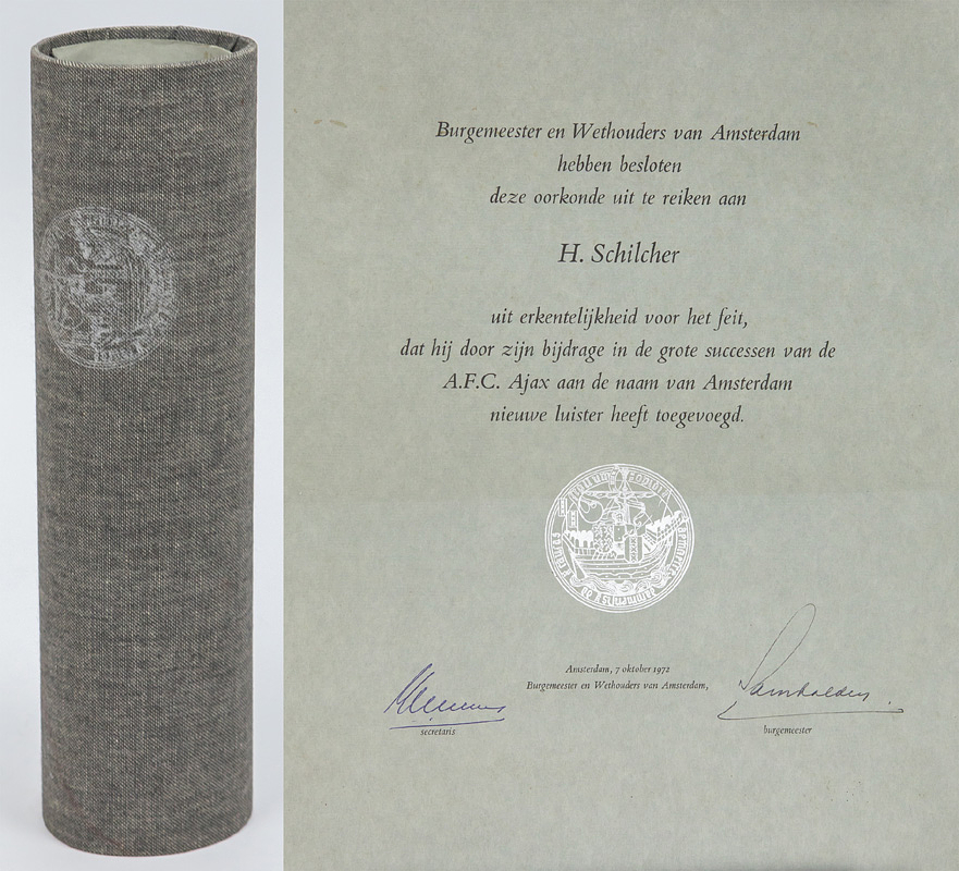 Ehrenurkunde der Stadt Amsterdam für den Spieler von Ajax Amsterdam Heinz Schilcher (1947-2018) für den Sieg mit Ajax im Europapokal der Landesmeister 1972. Urkunde datiert 7.10.1972. 40x30 cm in original Urkundenrolle.