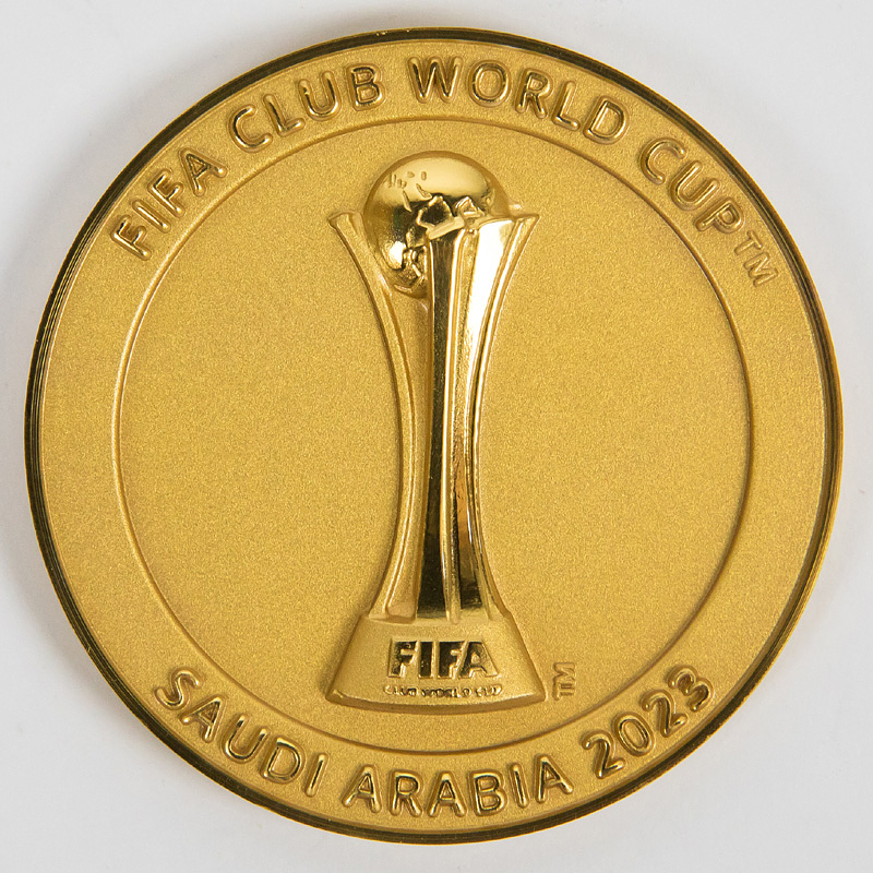 „FIFA Club World Cup Qatar 2023“. Offizielle Teilnehmermedaille für Betreuer, Funktionäre und Spieler der FIFA Club-Weltmeisterschaft 2021 in UAE (Vereinigte Arabische Emirate) die von Manchester City gewonnen wurde. Bronze, vergoldet, 5,0 cm. Im Originaletui.