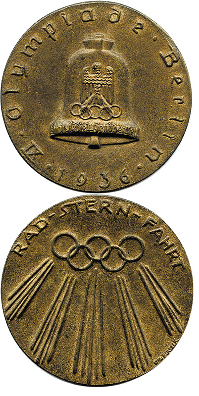 Große Bronzegußmedaille (v.Otto Placzek, Berlin) für die Teilnehmer der Rad-Stern-Fahrt nach Berlin anlässlich der Olympischen Spiele 1936. 6,8cm.