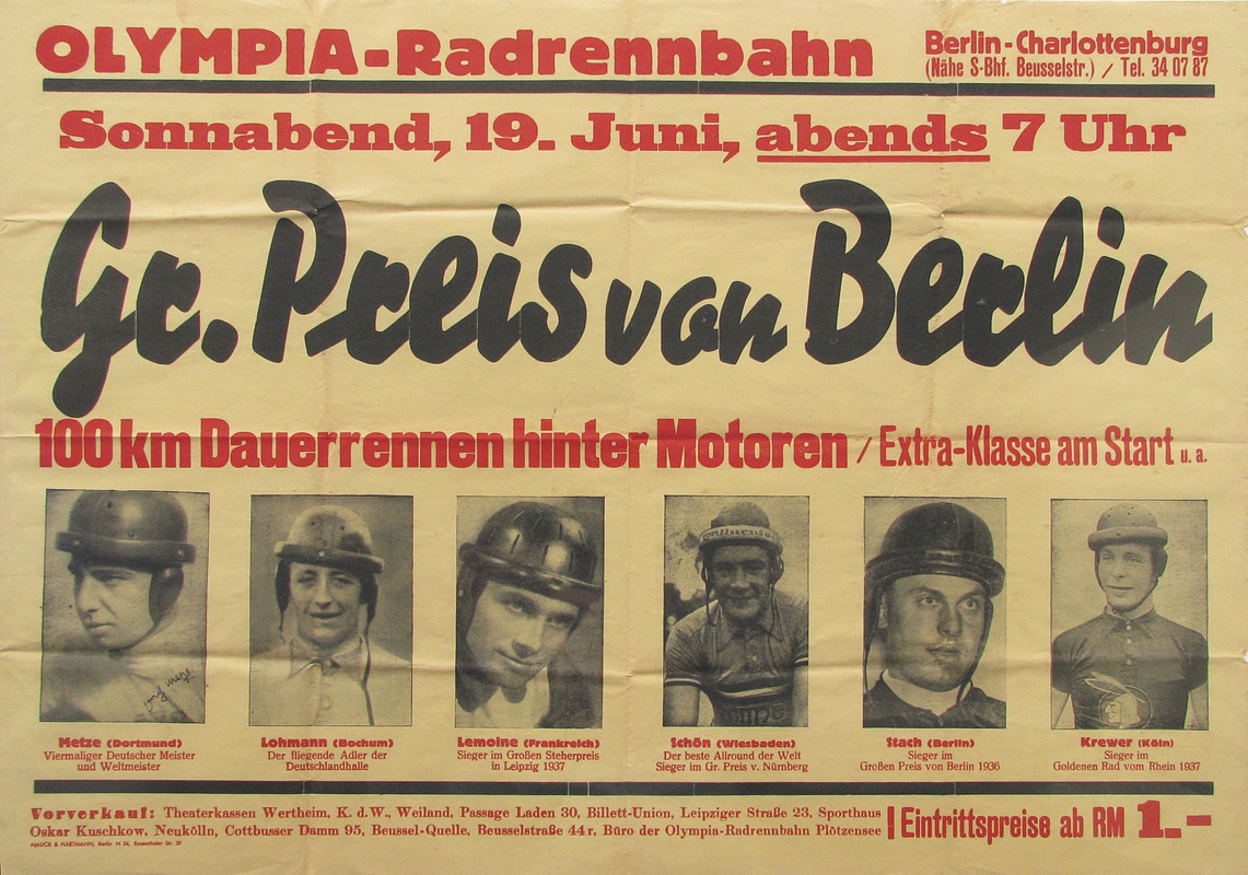 "Großer Preis von Berlin. Olympia Radrennbahn 19.Juni (1937)" Offizielles Plakat für das Radsportereignis "100 km Dauerrennen hinter Motoren". 87x61 cm.