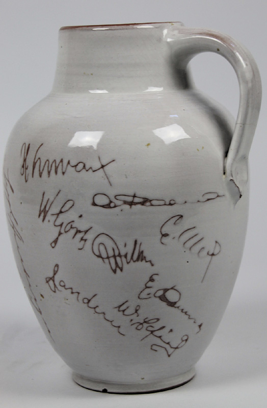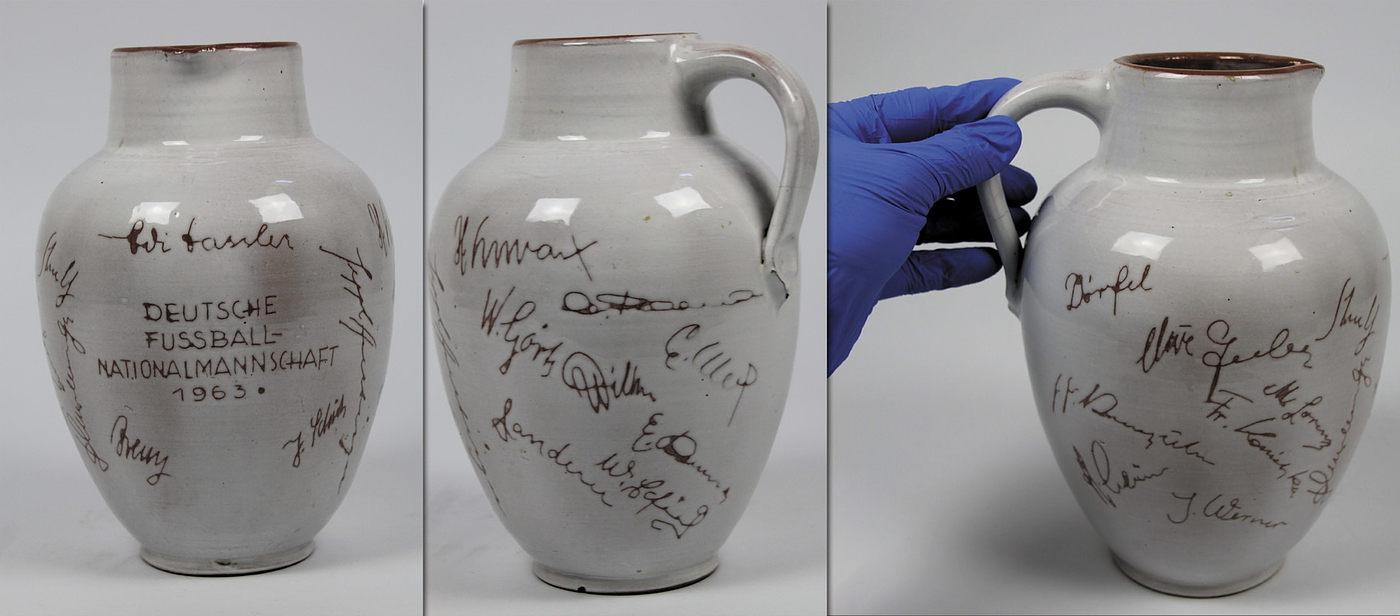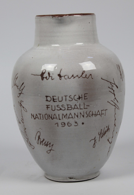 Handgearbeiteter Keramikkrüg „Deutsche Fussball-Nationalmannschaft 1963“ mit den eingebrannten Unterschriften der deutschen Nationalspieler. Höhe: 23 cm.