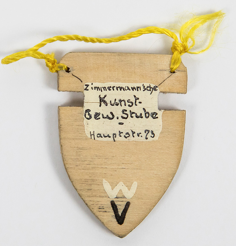 Handgefertiges Souvenirabzeichen für die Olympischen Spiele Berlin 1936. Handbemaltes Holzabzeichen mit den Olympischen Ringen, den Berliner Bär und der Aufschrift "Verlin 1936". 3,5x3,5 cm mit original Seidenbändchen. Hersteller: Zimmermansche Kunst Gewerbe-Stube Hauptstr. 23".
