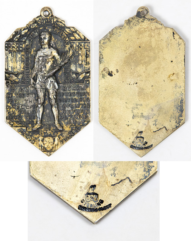Offizielle Ehrenmedaille für Athleten der USA an den Olympischen Sommerspielen Paris 1924. Mit der Aufschrift "On behalf of the city of New York to the victorius American Athletes on their returning the Olympic Games at Paris France" (1924). Silber (gepunzt "Sterling"; 22 Gramm), vergoldet, 5,2x3 cm.