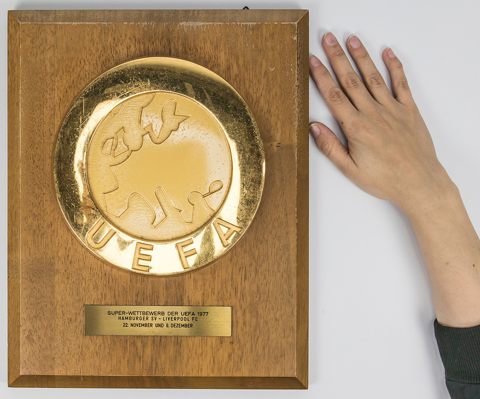 Offizielle Ehrenplakette der UEFA für den DFB anlässlich des Europapokalendspieles Landesmeister und Pokalsieger 1977 - Supercup. Große, vergoldete UEFA Logoplakette (20 cm) aufmontiert auf Holzplatte. Mit aufgesetzter gravierter Messingplakette mit der Inschrift "Super-Wettbewerb der UEFA 1977 Hamburger SV - Liverpool FC 22.November und 6.Dezember" (1:1 + 0:6). Hersteller: Huegenin, Susse. 35x28 cm. Museumstück!.