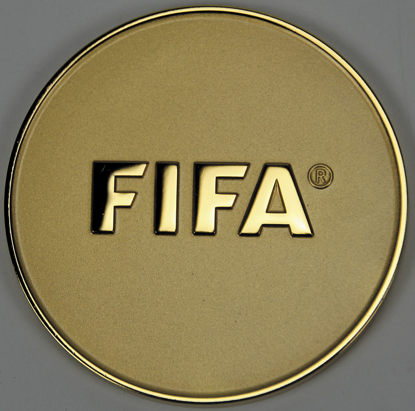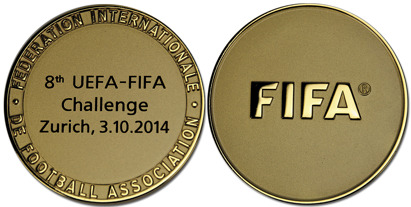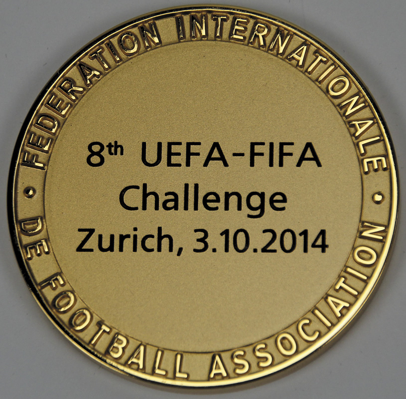 Offizielle Teilnehmermedaille "4th UEFA - FIFA Challenge Zurich, 3.10.2014". Bronze. Vergoldet, 5 cm in original Holzbox.