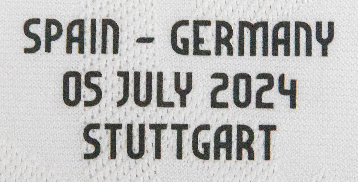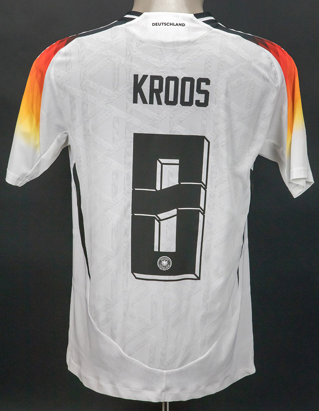 Trikot kurzarm; Größe S; DFB-Logo, 4 Weltmeister-Sterne und adidas-Logo gummiert; Match Details, Spielername und Rückennummer (vorn und hinten) gummiert; Schriftzug 'Deutschland' auf Kragenrückseite gummiert; Trikot mit UEFA Euro 2024 Trophy Patch und UEFA Foundation für children Patch; adidas Heat.Rdy. Trikot kommt aus der Sammlung eines DFB-Betreuers. Zustand: A