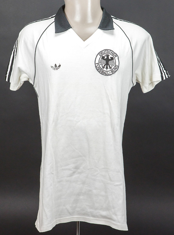 Trikot kurzarm; Größe L - 7/8; DFB-Logo aufgenäht; adidas-Logo dünn aufgummiert; Rückennummer aus Kunststoff gummiert; adidas. Hrubesch hat gegen Argentinien gespielt, gegen Brasilien Ersatzbank. Zustand: A-