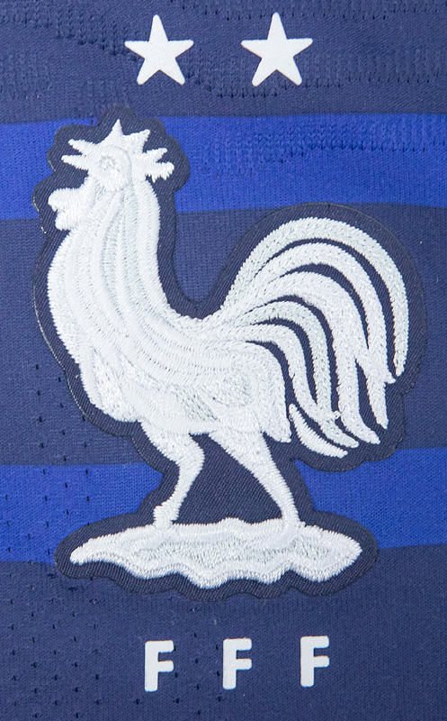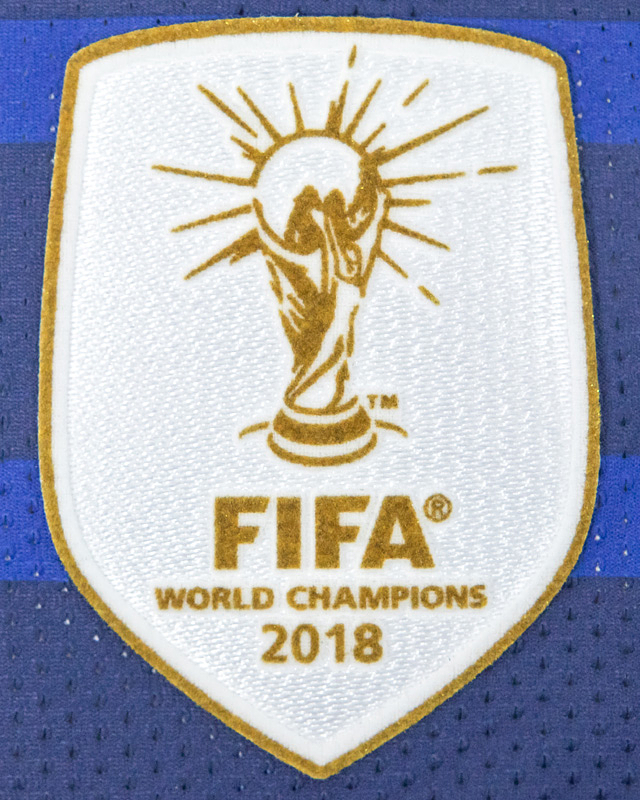 Trikot kurzarm; Größe L; Verbands-Logo, 2 Weltmeistersterne und Nike-Logo gummiert; FIFA World Champions 2018 Badge geflockt; Match Details gummiert; Spielername und Rückennummer (vorn und hinten) gummiert; Nike Vaporknit. Trikot kommt von einem Mitarbeiter von Bayern München der dieses Trikot von Dayot Upamecano erhalten hat. Zustand: A