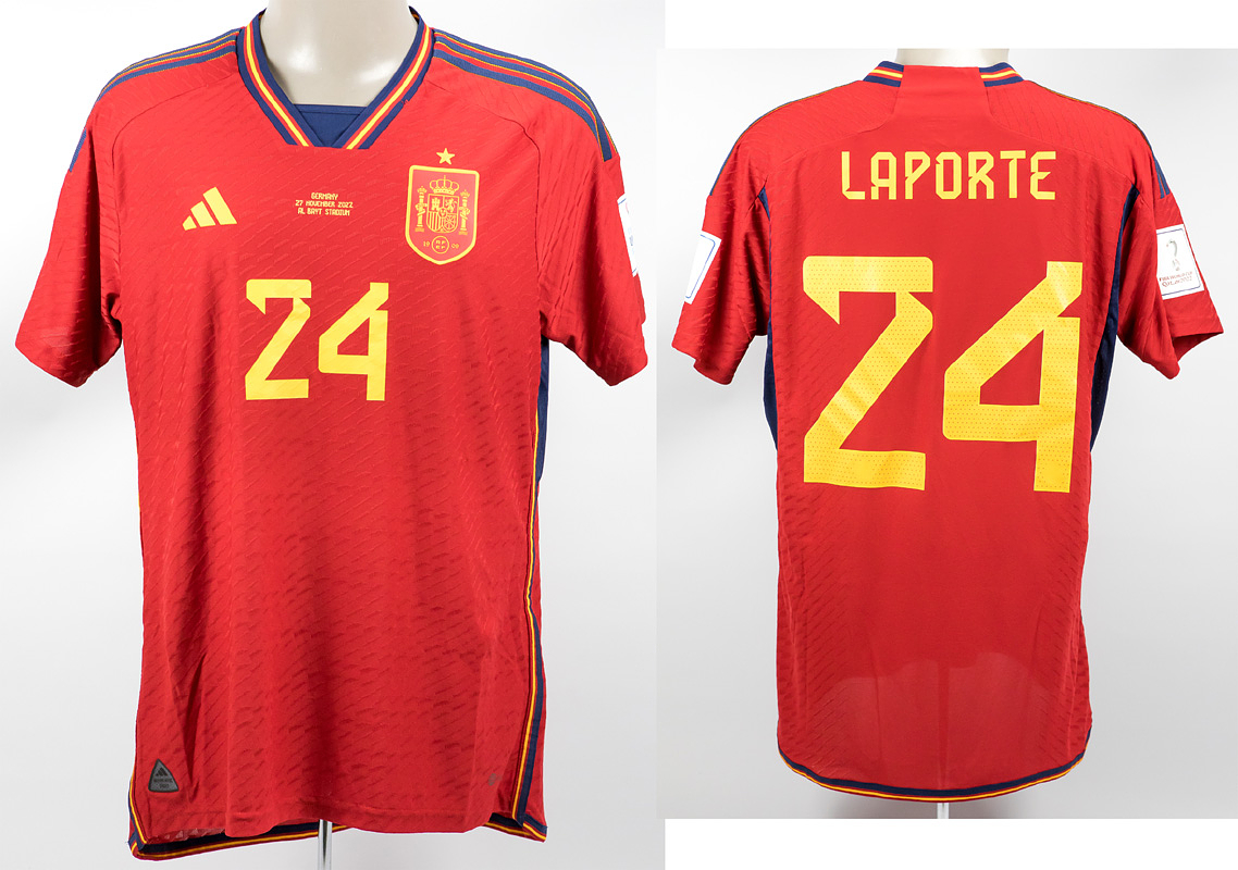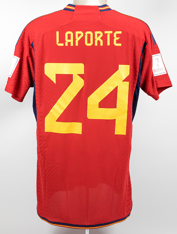 Original match worn / issued Spielertrikot von Spanien mit der Rückennummer 24. Getragen von Aymeric Laporte am 27.11.2022 im Gruppenspiel der Fußball Weltmeisterschaft gegen Deutschland. Spanien - Deutschland 1:1. Laporte ist UEFA Nations- Leaguue-Sieger 2023. Status:AAB.
