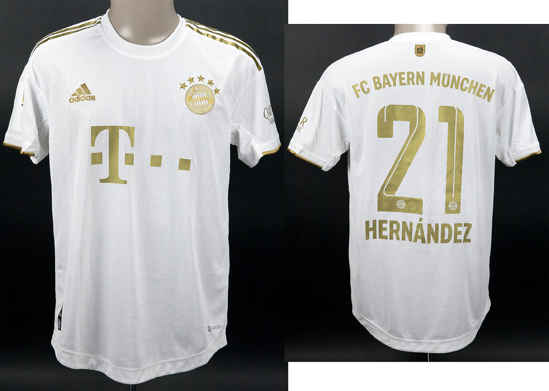 Original match worn Spielertrikot vom FC Bayern München mit der Rückennummer 21. Getragen von Lucas Hernandez am 21.08.2022 im Spiel der Fußball Bundesliga gegen den VfL Bochum. Bochum - Bayern 1:7. Hernandez ist 37-facher Nationalspieler von Frankreich. Status: AAB.