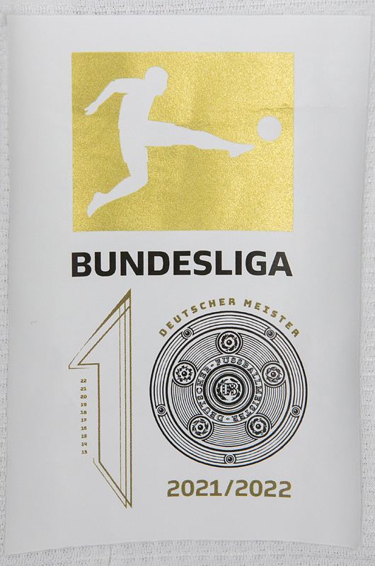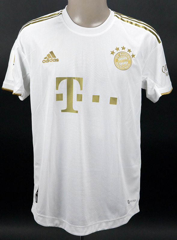Trikot kurzarm; Größe 5; Vereins-Logo, 5 Meistersterne und adidas-Logo gummiert; Werbeaufdruck `-T---` gummiert; Münchner Kindl Wappen auf Kragenrückseite gummiert; Spielername, Rückennummer und Schriftzug 'FC Bayern München' gummiert; mit BL Deutscher Meister 2021/2022 Patch und Qatar Airways Patch; adidas Heat.Rdy. Kommt direkt von einem ehemaligen DFB Mitarbeiter. Zustand: A