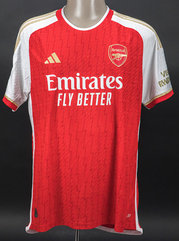 Trikot kurzarm; Größe L; Vereins-Logo, adidas-Logo und Werbeaufdruck 'Emirates Fly Better' gummiert; Rückennummer und Spielername gummiert; Schriftzug 'AFC' auf Kragenrückseite gummiert; mit CL Starball Patch, UEFA Foundation for children Patch und Visit Rwanda Patch; adidas Heat.Rdy. Trikot kommt von einem Mitarbeiter von Bayern München. Zustand: A
