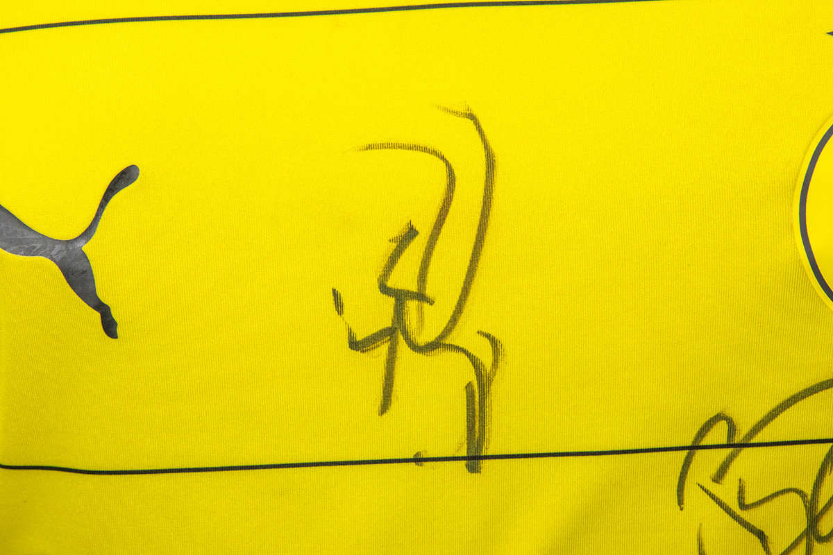 Original match worn Spielertrikot von Borussia Dortmund mit der Rückennummer 17. Getragen von Pierre-Emerick Aubameyang in der Fußball-Bundesliga-Saison 2015/2016. Mit Original Autograph von Aubameyang und einigen anderen Spielern auf der Vorderseite. Status:ABC.