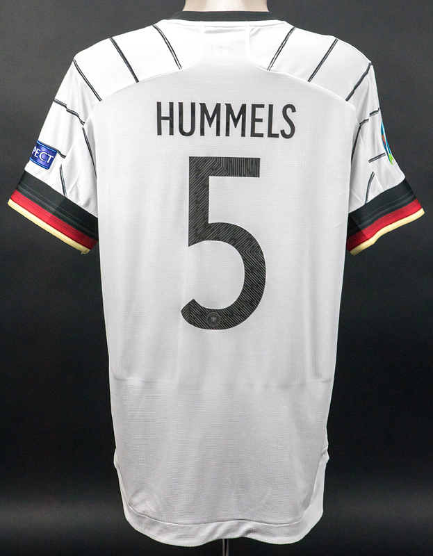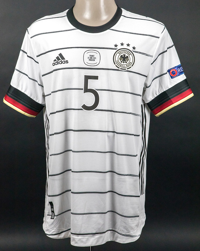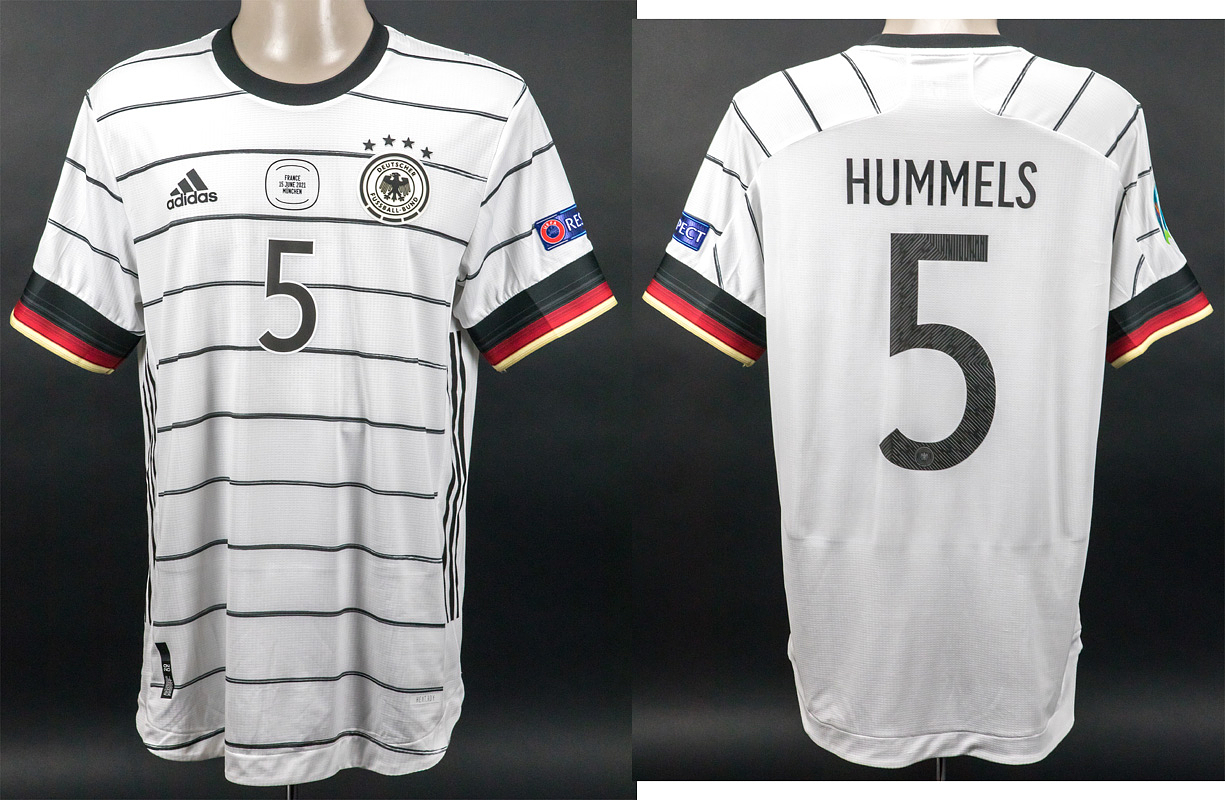 Original match worn Spielertrikot von Deutschland mit der Rückennummer 5. Getragen von Mats Hummels am 15.06.2021 im Gruppensspiel der Fußball Europameisterschaft gegen Frankreich. Frankreich - Deutschland 1:0. Trikot ist ungewaschen. Status:AAC.