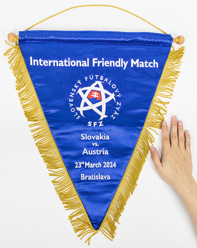 Original Tauschwimpel der Fußballnationalmannschaft der Slowakei vom Freundschaftsspiel gegen Österreich mit der aufgestickten Inschrift "International Friendly Match. Slovakia vs Austria. 23rd March 2024 Bratislava". Seidenwimpel mit Seidenfransen. Holzstange mit Holzkugeln, 50x42 cm. Bei diesem Exemplar handelt es sich um den Wimpel den die Mannschaftskapitäne im Mittelkreis vor Spielbeginn getauscht haben.