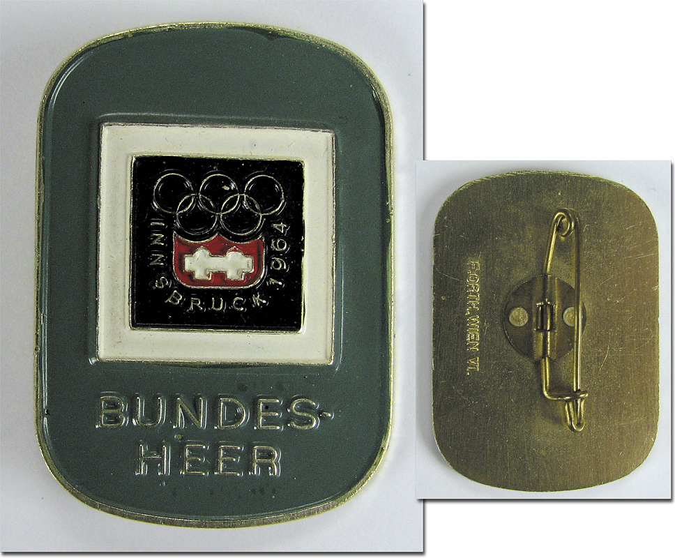 Teilnehmerabzeichen für die Olympischen Winterspiele Innsbruck 1964 „Bundesheer“. Aluminium, mehrfarbig emailliert, 4,2 x3 cm.