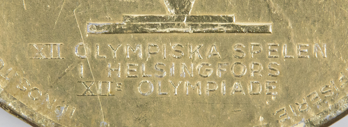 Zwei seltene Souvenirstücke für die Olympischen Spiele 1940 in Helsinki: 1) Schokoldendose bezogen mit geprägten Goldpapier und der Aufschrift "XII. Olympialaiset Helsinki 1940". Pappe 9,5x1,2 cm (ohne Inhalt). 2) Streichholzschachtel "Karhu" mit den Olympischen Ringen, Pappe 5,5x3,5x1,5 cm (ohne Inhalt).
