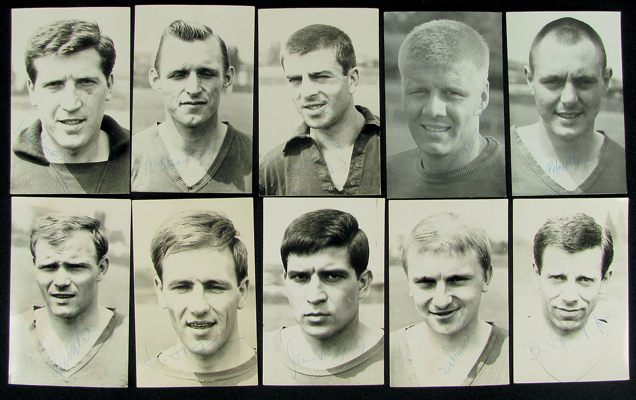 10 S/W-Fotoautogrammkarten mit Spielern von Fortuna Düsseldorf ca. 1967 mit original Signaturen, je 14x9 cm.