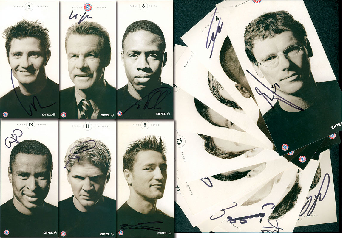 18 offizielle Autogrammkarten "Opel" mit original Signaturen von Spielern des FC Bayern München aus der Saison 2001/02. Je 21x10,5 cm.